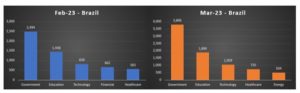 O setor governamental continua sendo o mais atacado pelo cibercrime no Brasil, seguido pelos segmentos de educação, tecnologia e saúde. Em março, o setor energético tomou o lugar do financeiro no top 5 dos segmentos mais alvejados no país.