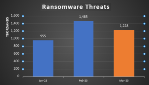 Já o número de ataques ransomware, que tinha aumentado de janeiro para fevereiro, apresentou queda em março, recuando de 1 milhão 465 mil ocorrências para 1 milhão 228 mil. O trimestre registra queda de 12% nos casos de ransomware, em comparação com o mesmo período do ano passado, com um total de 3 milhões 648 mil ataques ransomware em 2023 contra 4 milhões 440 mil em 2022.