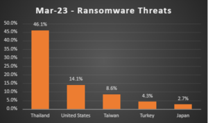 Em março, a Tailândia manteve a primeira posição no ranking de países mais atingidos por ransomware (46,1%), seguida pelos Estados Unidos, que tiveram 14,1% das ameaças, Taiwan e Turquia, com 8,6% e 4,3%, respectivamente. O Japão, com 2,7% dos registros, completa o top 5.