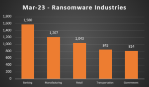 O setor bancário continuou a ser o mais visado pelos cibercriminosos, com 1.580 ataques em março, seguido pela indústria e varejo, com 1.207 e 1.043 ataques, respectivamente. Os setores de transporte (845) e governo (814) também sofreram um número significativo de ameaças ransomware, no período.