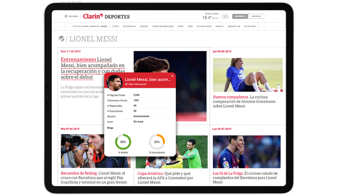 No Clarín, o objetivo sempre foi aproximar informações gerenciais e analíticas das plataformas de uso natural dos usuários. No caso específico da redação, são mais de 400 jornalistas que precisam ter acesso aos indicadores da performance de seus conteúdos em tempo real. Em 2017, com a ideia de inovação em mente, o periódico passou por um grande processo de transformação e criou uma sala de redação multiplataforma, que funciona simultaneamente para as diferentes versões do jornal, como impresso, digital e em dispositivos móveis. A incorporação do Business Intelligence (BI) e Analytcs aconteceu no início de 2015, quando a empresa tomou a decisão de construir um departamento de Big Data e Analytics para fornecer serviços de dados para todas as áreas.